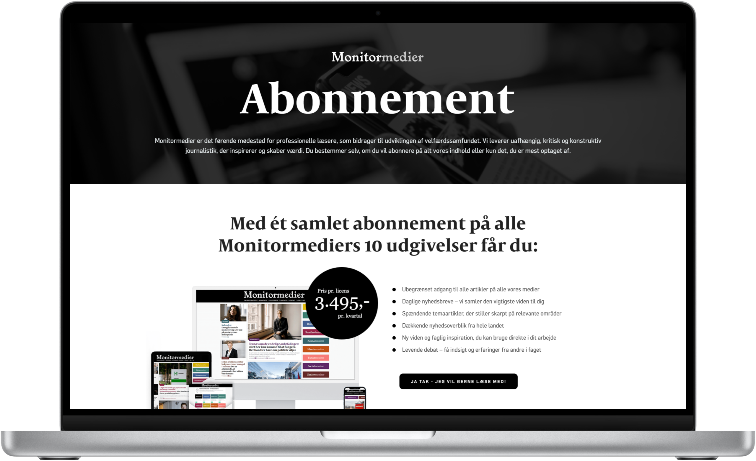 Monitormedier havde behov for målrettede landing pages til forskellige formål: abonnement, prøveabonnementer, support, jobannoncer og bannerannoncering. Alle sider skulle være lette at navigere i, tilpasset forskellige målgrupper og optimere brugerrejsen fra interesse til handling.