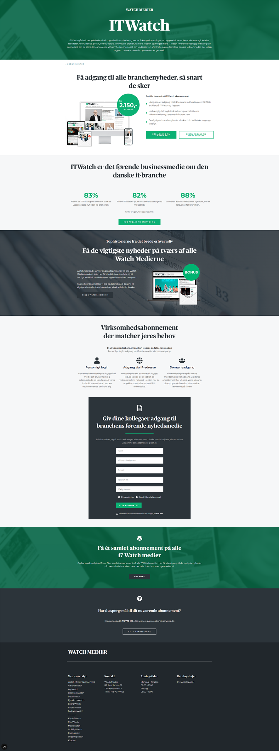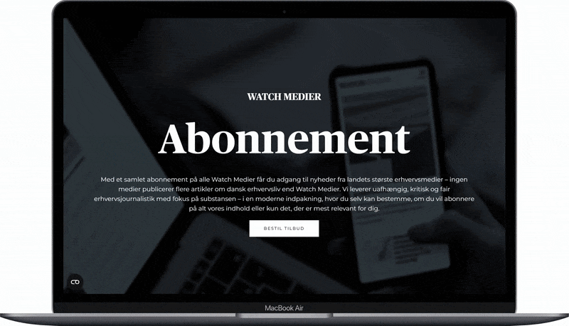 Projekt: Design og udvikling af en række konverteringsoptimerede landing pages til Watch Medier, der understøtter abonnementssalg, virksomhedsprøver, support, job- og bannerannoncering.